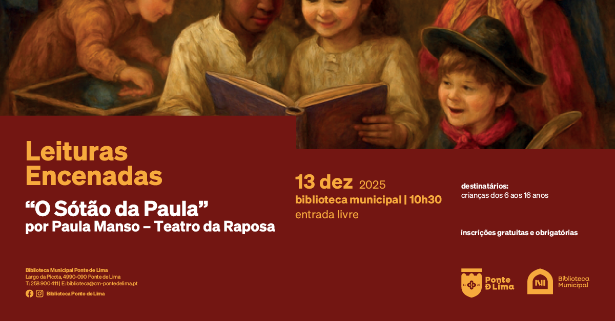 O Município de Ponte de Lima lança um novo programa cultural dirigido a crianças e jovens dos 6 aos 16 anos, intitulado "Leituras Encenadas – O Sótão da Paula". Esta iniciativa propõe uma experiência única de aproximação à literatura infantil e juvenil, onde os livros ganham vida através da imaginação, da expressão dramática e do espírito criativo dos participantes.