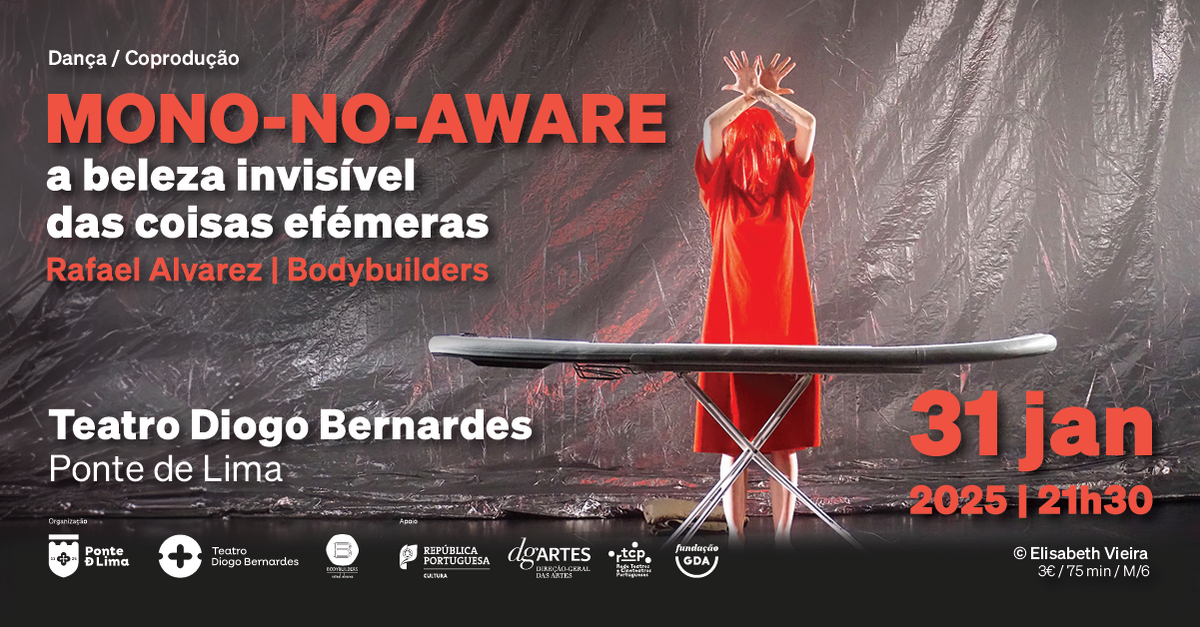 No dia 31 janeiro de 2025, às 21h30, o Teatro Diogo Bernardes em Ponte de Lima apresenta, em coprodução o espetáculo de Dança, "MONO-NO-AWARE", a beleza invisível das coisas efémeras | BodyBuilders & Rafael Alvarez.