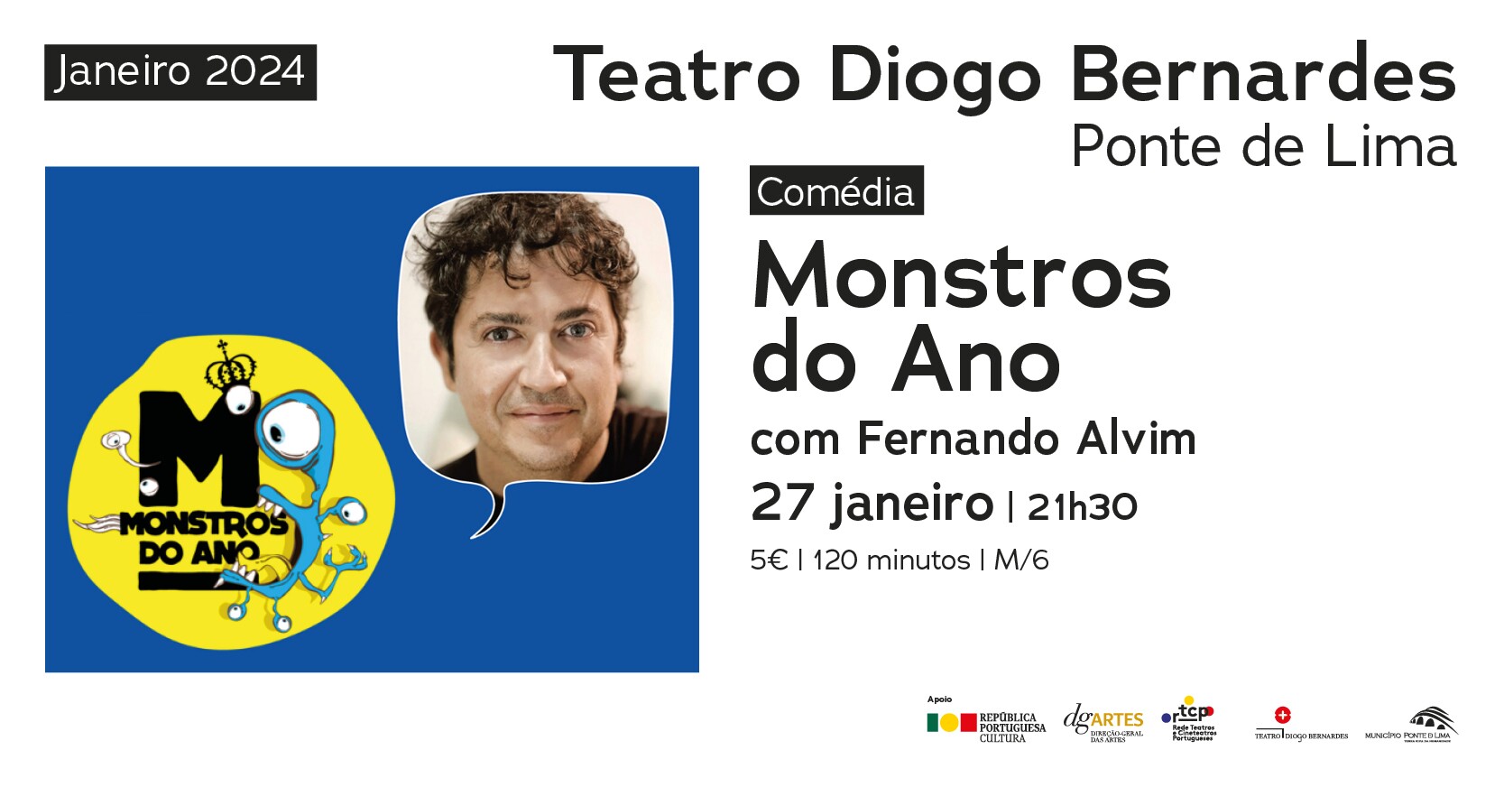 No dia 27 de janeiro de 2024, às 21h30, o Teatro Diogo Bernardes em Ponte de Lima apresenta, o espetáculo de Comédia "Monstros do Ano", com Fernando Alvim.