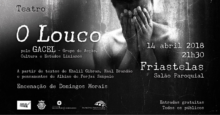 A 14 de abril, às 21h30, no Salão Paroquial de Friastelas, com entradas gratuitas, O Louco, a partir de textos de Khalil Gibran, Raul Brandão e pensamentos de Albino de Forjaz Sampaio, pelo GACEL - Grupo de Acção, Cultura e Estudos Limianos, com encenação de Domingos Morais.