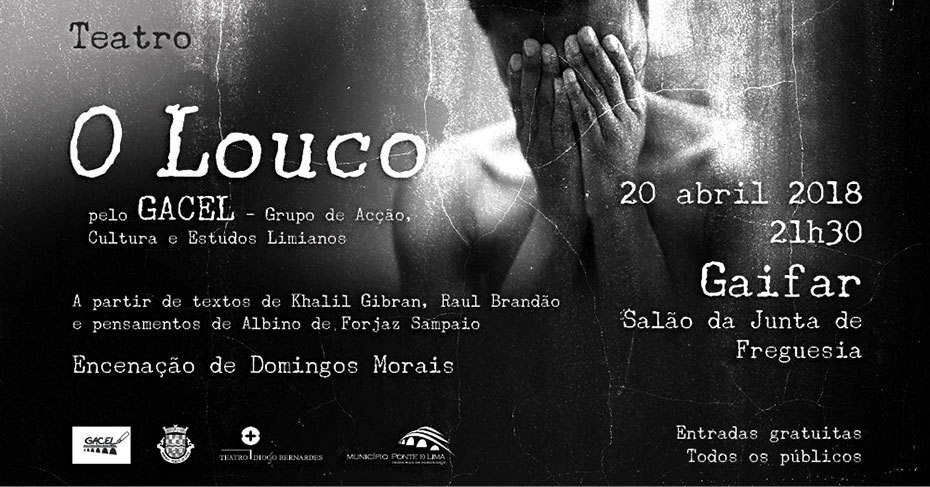 A 20 de abril, às 21h30, no Salão da Junta de Freguesia de Gaifar, com entradas gratuitas, O Louco, a partir de textos de Khalil Gibran, Raul Brandão e pensamentos de Albino de Forjaz Sampaio, pelo GACEL - Grupo de Acção, Cultura e Estudos Limianos, com encenação de Domingos Morais.