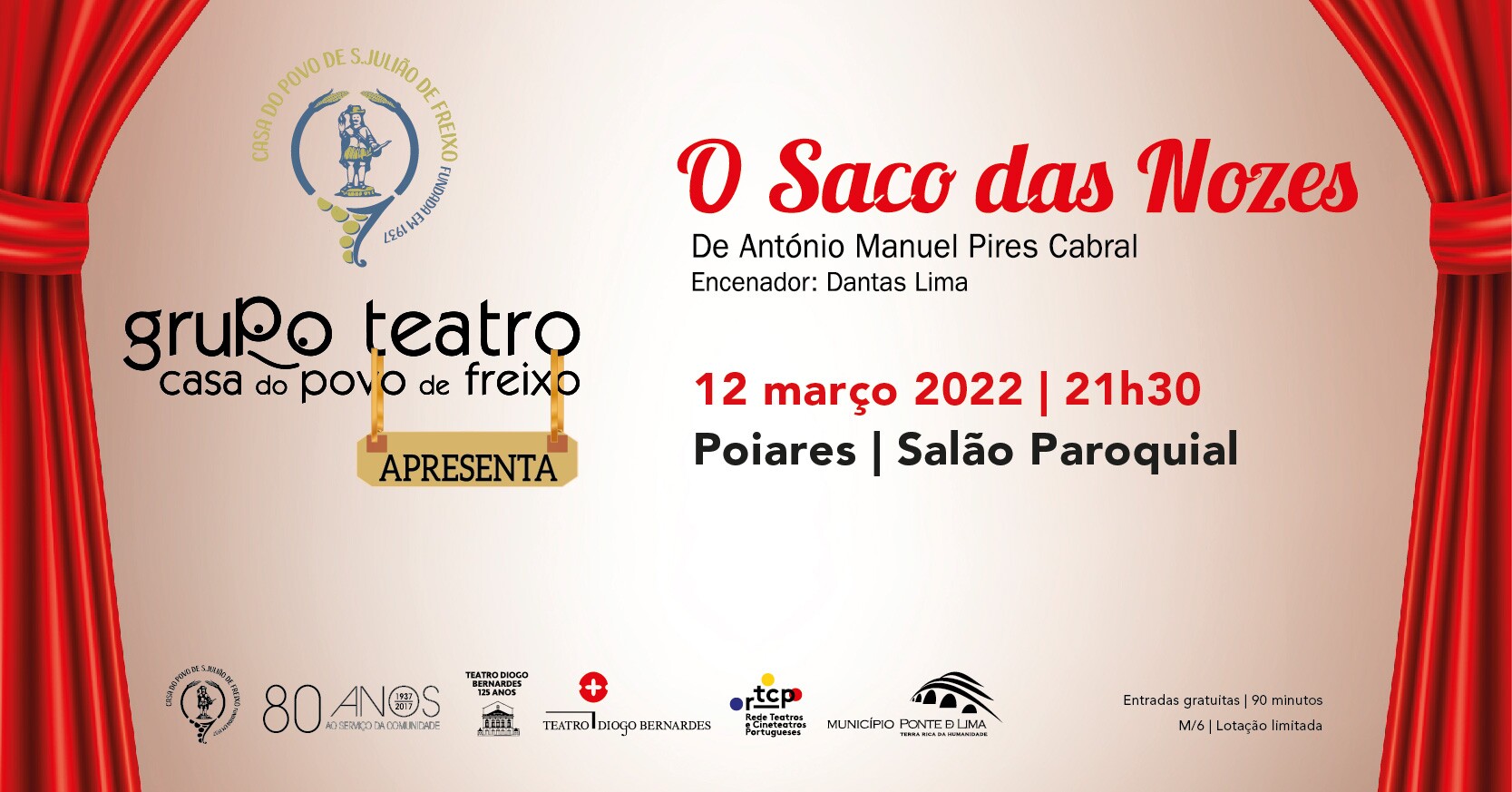 A 12 de março de 2022, às 21h30, no Salão Paroquial de Poiares, com entradas gratuitas, O Saco das Nozes, de António Manuel Pires Cabral, pelo Grupo de Teatro da Casa do Povo de Freixo.