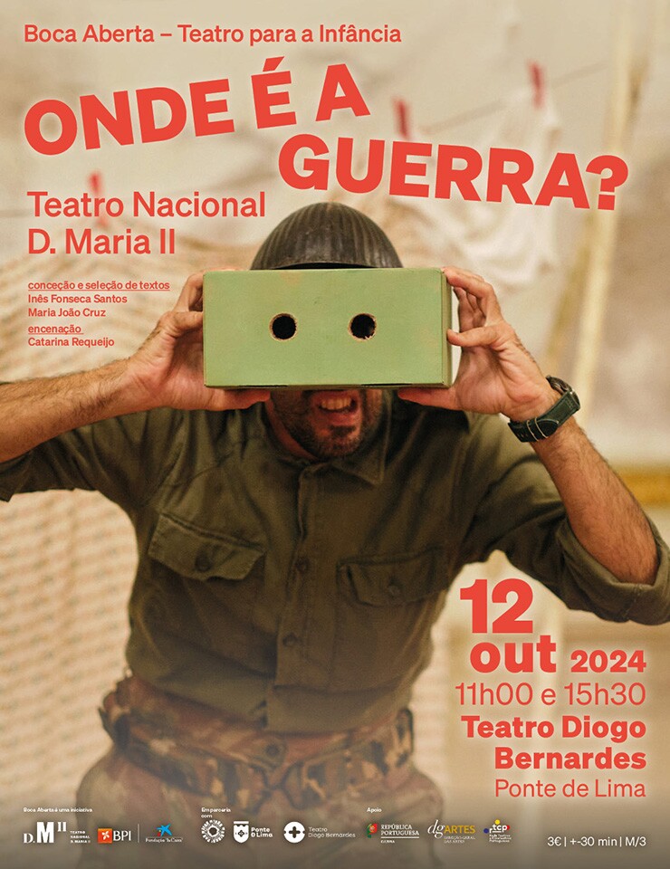 No dia 12 de outubro de 2024, às 11h00 e 15h30, o Teatro Diogo Bernardes em Ponte de Lima apresenta, o espetáculo de teatro infantil/famílias "Onde é a Guerra?" | Teatro Nacional D. Maria II.