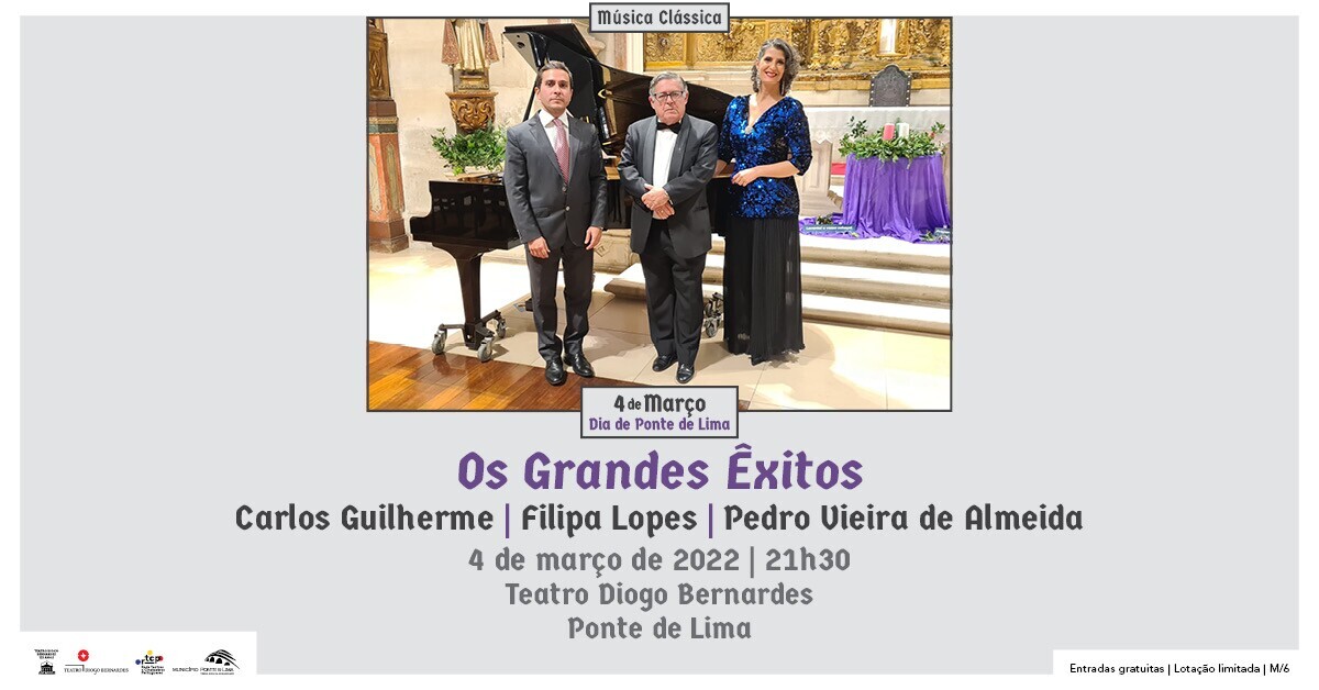 A 4 de março 2022, às 21h30, integrado nas Comemorações do Dia de Ponte de Lima, o Teatro Diogo Bernardes apresenta o espetáculo de Música Clássica “Os Grandes Êxitos” com Carlos Guilherme, Filipa Lopes e Pedro Vieira de Almeida.