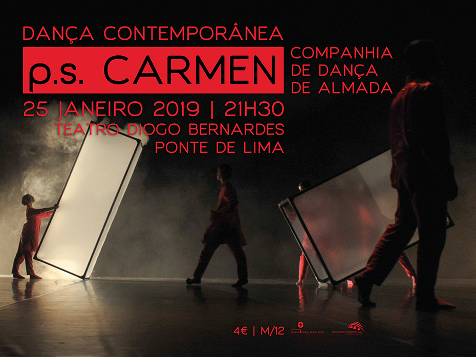 A 25 de janeiro, às 21h30, no Teatro Diogo Bernardes, em Ponte de Lima, a Companhia de Dança de Almada apresenta p.s. CARMEN, espectáculo de dança contemporânea com coreografia de Margarida Belo Costa, um espectáculo para maiores de 12 anos.