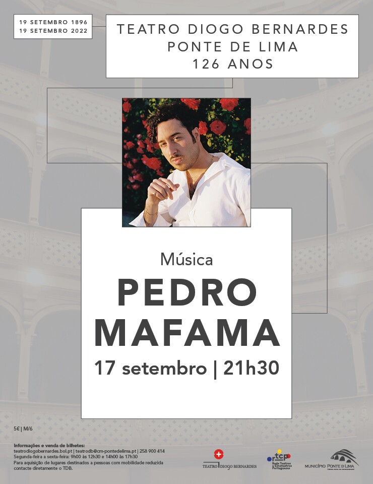 A 17 de setembro de 2022, às 21h30, o Teatro Diogo Bernardes em Ponte de Lima, apresenta o espetáculo de música “Pedro Mafama”.