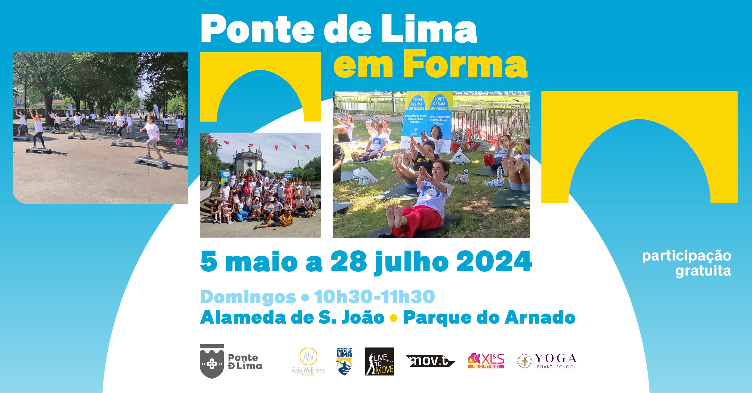 O Município de Ponte de Lima em parceria com vários Ginásios do concelho vai realizar o programa "Ponte de Lima em Forma 2024". O evento decorre todos os domingos, de 5 de maio a 28 de julho, das 10h30 às 11h30, na Alameda de São João e no Parque do Arnado.