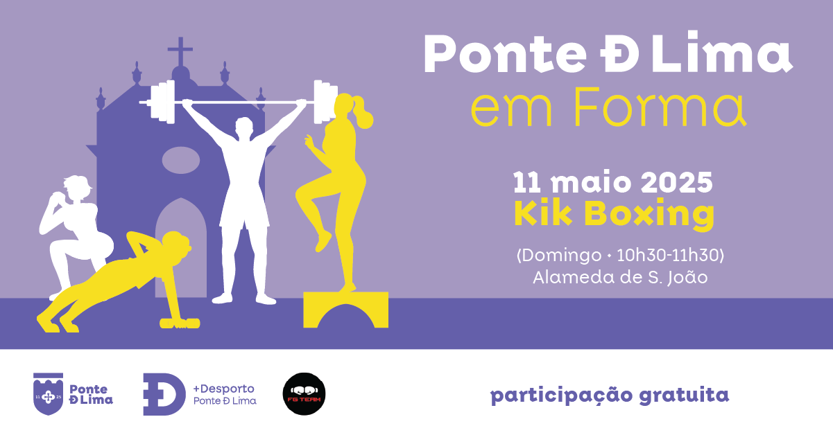 Dia 11 de maio de 2025, o Município de Ponte de Lima, em parceria com a FG Team, realiza o programa "Ponte de Lima em Forma" com uma aula gratuita de Kick Boxing, das 10h30 às 11h30, na Alameda de São João.