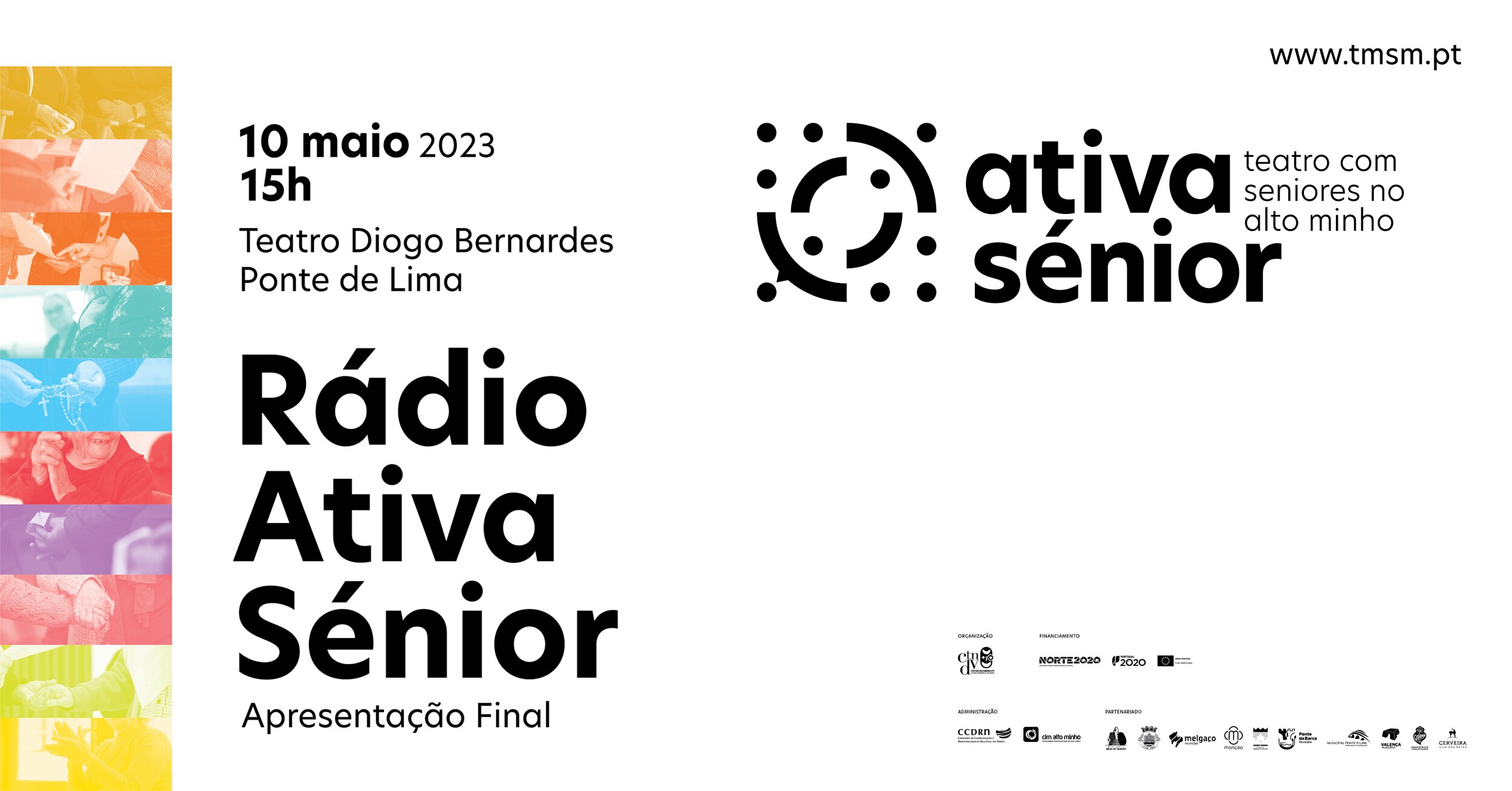 No ATIVAsénior - Teatro com Seniores no Alto Minho, projeto do Teatro do Noroeste - Centro Dramático de Viana, 5 criadores artísticos trabalharam 24 meses com 10 grupos de até 20 pessoas com idade igual ou superior a 60 anos de idade, residentes nos 10 concelhos do Alto Minho. Agora, juntam-se para um momento único de celebração da memória, do presente e do porvir, através do teatro, com a apresentação final do Projeto ATIVAsénior no Teatro Diogo Bernardes.