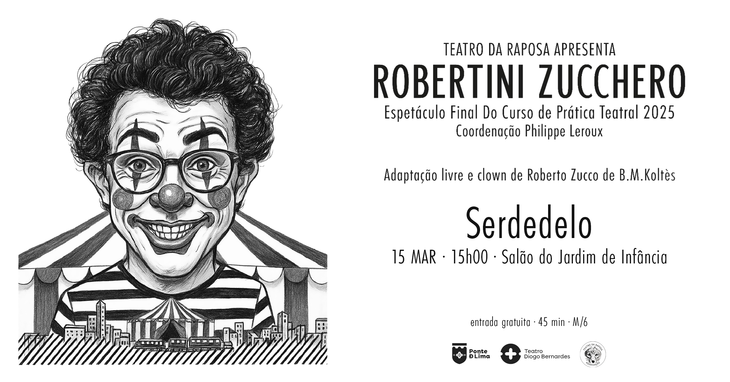 No dia 15 de março de 2026, às 15h00, o Município de Ponte de Lima e o Teatro da Raposa apresentam o espetáculo final do curso de prática teatral "Robertini Zucchero", no salão do Jardim de Infância de Serdedelo.