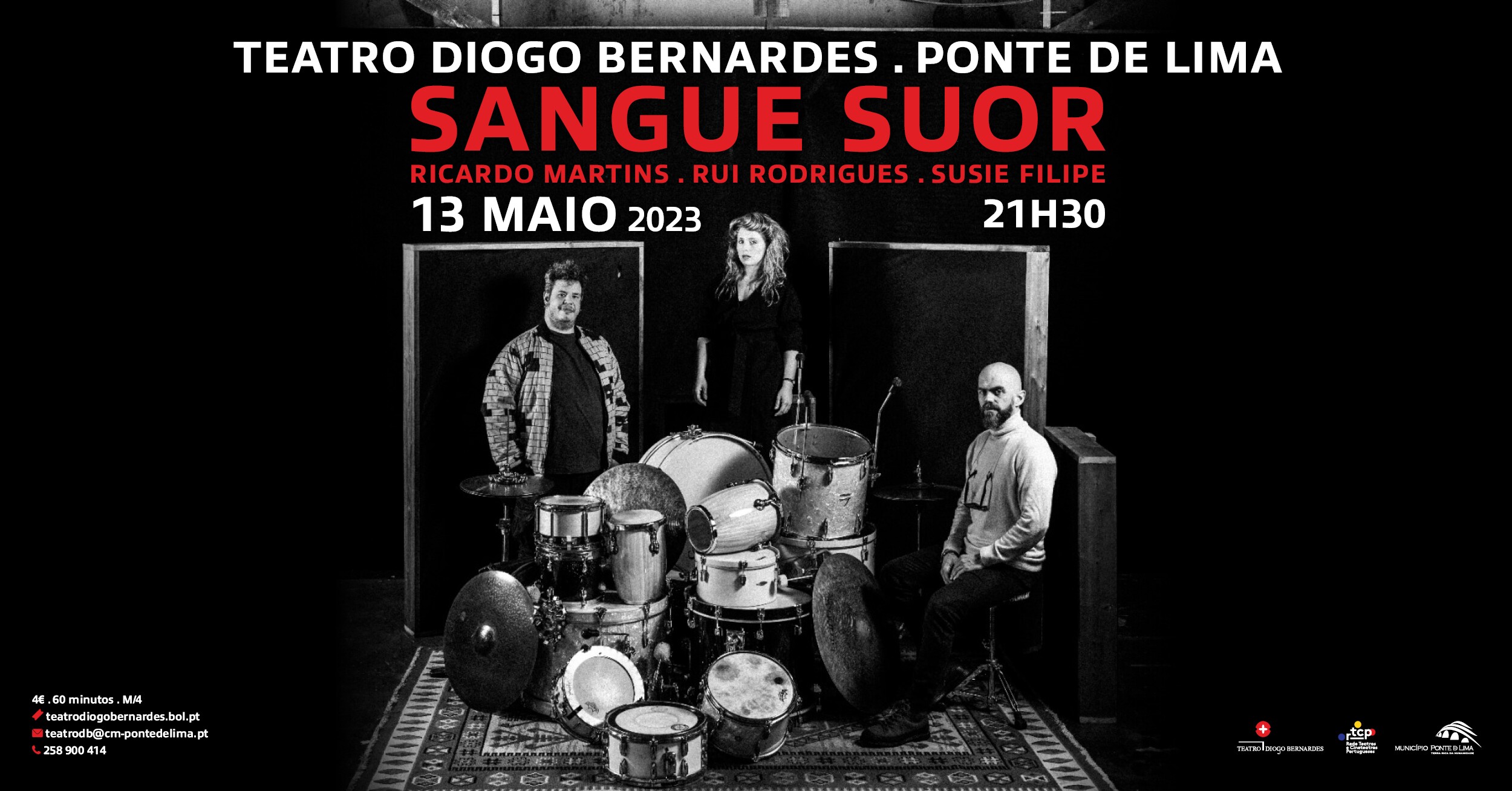 No dia 13 de maio de 2023, às 21h30, o Teatro Diogo Bernardes em Ponte de Lima apresenta, o espetáculo de Música "Sangue Suor", com Ricardo Martins, Rui Rodrigues e Susie Filipe.