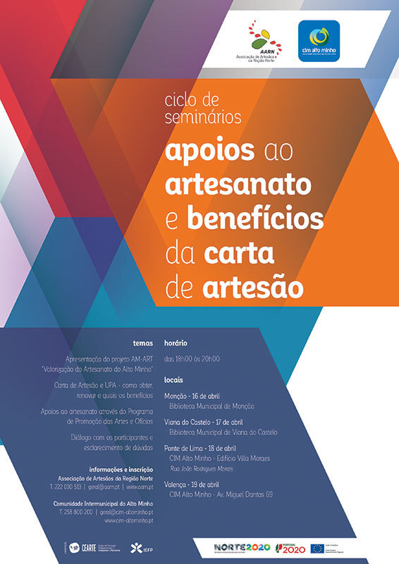 A Comunidade Intermunicipal do Alto Minho (CIM Alto Minho), em colaboração com a Associação de Artesãos da Região Norte vão organizar um Seminário – “Apoios ao Artesanato e benefícios da Carta de Artesão”, com o objetivo de informar os produtores sobre como obter/renovar a Carta de Artesão e de Unidade Produtiva Artesanal e respetivos benefícios, bem como informar sobre os apoios existentes ao artesanato através da divulgação do Programa de Promoção das Artes e Ofícios.