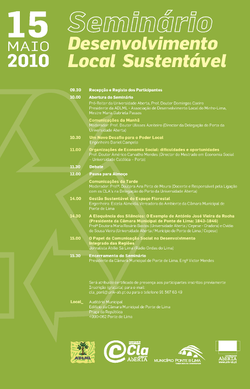 O "Desenvolvimento Local Sustentável" vai estar em análise num seminário a realizar no dia 15 de maio de 2010, no Auditório Municipal de Ponte de Lima, a partir das 9h30. O evento, de entrada gratuita mediante inscrição, é organizado pelo Centro Local de Aprendizagem (CLA) da Universidade Aberta (UAb) em Ponte Lima, em colaboração com a Câmara Municipal e com a Associação de Desenvolvimento Local do Minho-Lima (ADLML).