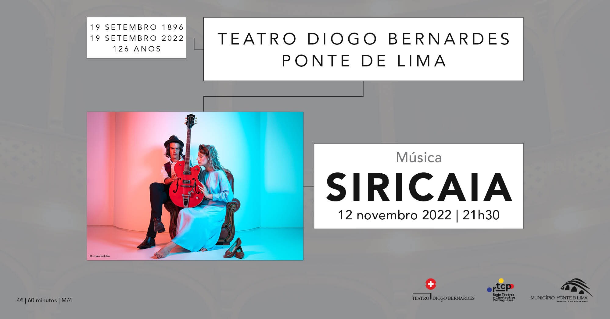 Bilhetes à venda na bilheteira física do Teatro Diogo Bernardes ou na bilheteira eletrónica em: https://teatrodiogobernardes.bol.pt.