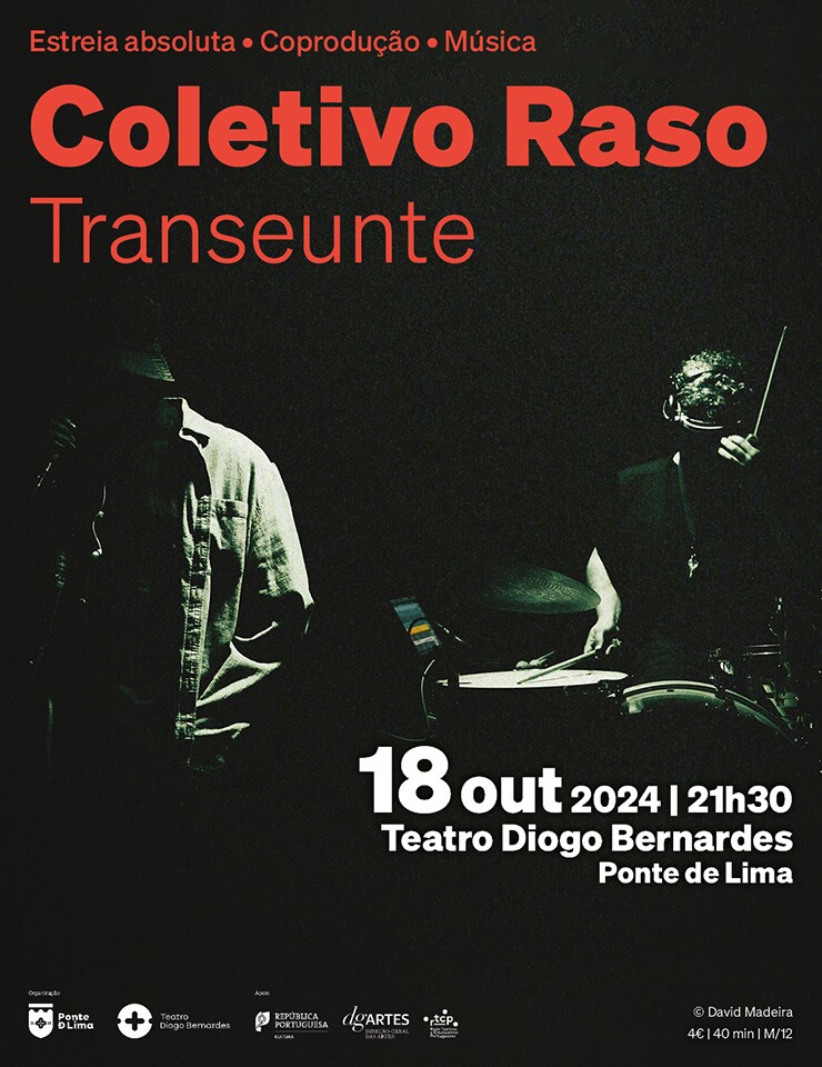 No dia 18 de outubro de 2024, às 21h30, o Teatro Diogo Bernardes em Ponte de Lima apresenta, em Estreia Nacional e Coprodução, o espetáculo de música "Transeunte" Coletivo Raso.