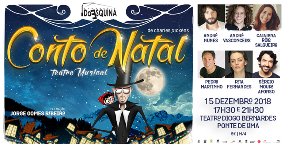 A 15 de dezembro, às 17h30 e às 21h30, no Teatro Diogo Bernardes, em Ponte de Lima, mais um espectáculo de teatro musical para toda a família - Conto de Natal, de Charles Dickens, pela Companhia da Esquina, com encenação de Jorge Gomes Ribeiro e interpretação de André Nunes, André Vasconcelos, Catarina Rôlo Salgueiro, Pedro Martinho, Rita Fernandes e Sérgio Moura Afonso, para maiores de 4 anos.