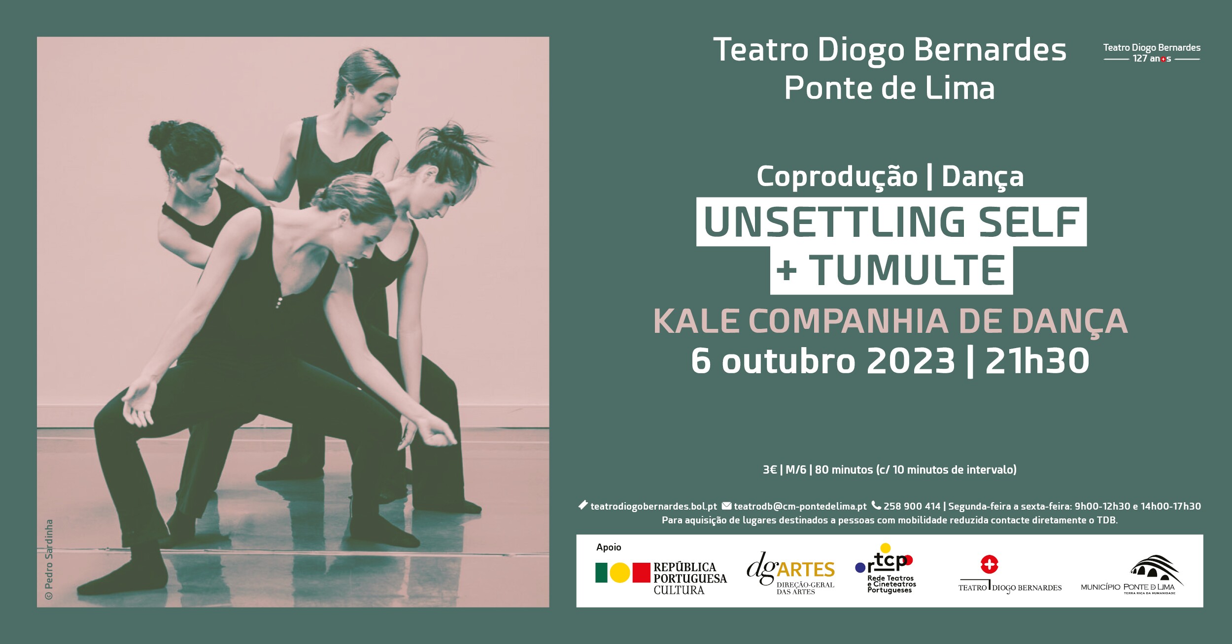 No dia 6 de outubro 2023, às 21h30, o Teatro Diogo Bernardes em Ponte de Lima apresenta em Coprodução, o espetáculo de Dança "UNSETTLING SELF" + "TUMULTE", pela KALE Companhia de Dança.