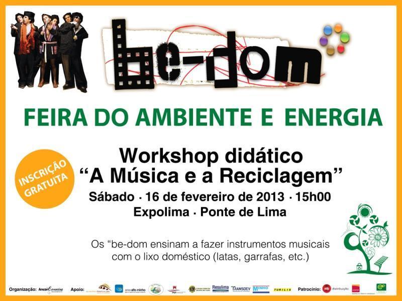 Workshop didático "A música e a reciclagem" inserido na II Feira do Ambiente e Energia. O grupo os "be-dom" ensinam a fazer instrumentos musicais com o lixo doméstico.