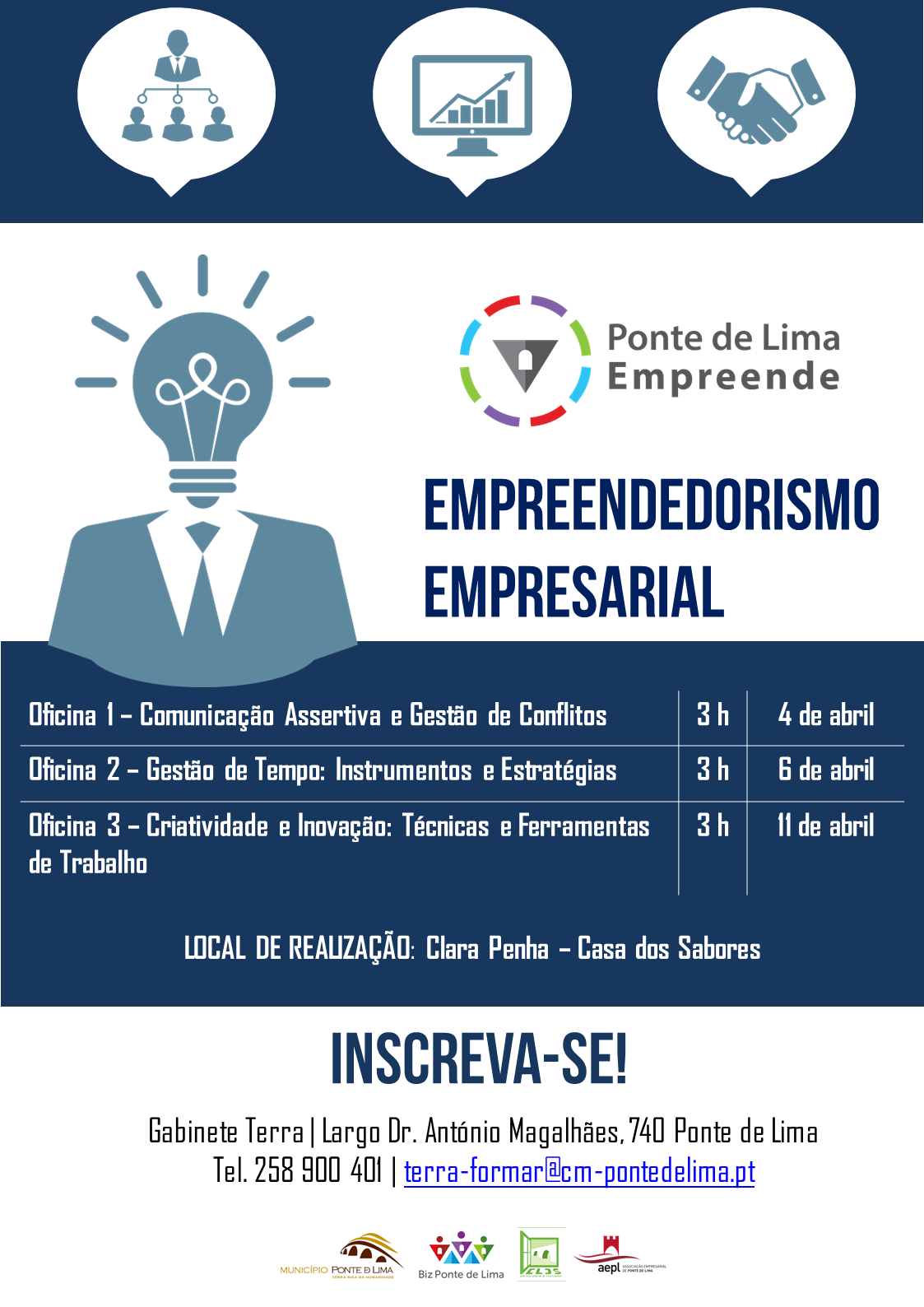 O Município de Ponte de Lima promove o workshop Empreendedorismo Empresarial, a decorrer nos dias 4, 6 e 11 de abril, na Clara Penha - Casa dos Sabores.