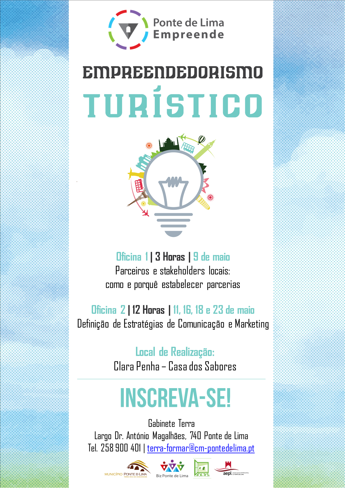 O Município de Ponte de Lima promove o workshop Empreendedorismo Turístico, a decorrer nos dias 9, 11, 16, 18 e 23 de maio, na Clara Penha - Casa dos Sabores.