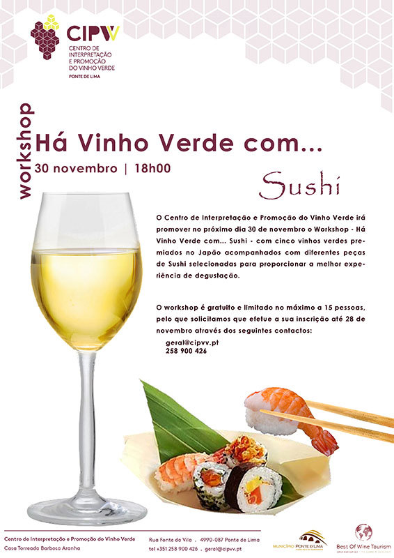 O CIPVV - Centro de Interpretação e Promoção do Vinho Verde irá promover no próximo dia 30 de novembro, às 18h00, o Workshop - Há Vinho Verde com... Sushi - com cinco vinhos verdes premiados no Japão acompanhados com diferentes peças de Sushi selecionadas para proporcionar a melhor experiência de degustação.