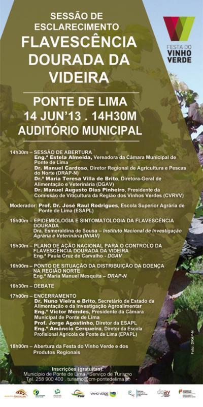 O Município de Ponte de Lima, em parceria com a Direção Geral de Alimentação e Veterinária e a Direção Regional de Agricultura e Pescas do Norte, promove, inserida no Programa da Festa do Vinho Verde e dos Produtos Regionais, uma sessão de esclarecimento sobre o tema "A Flavescência Dourada" no dia 14 de junho, as 14h30m, no Auditório Municipal.
