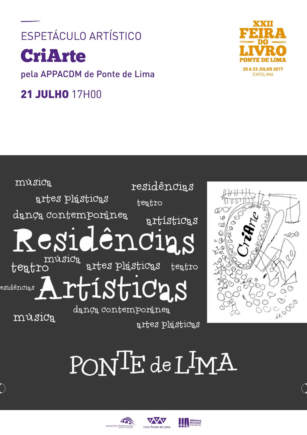 O Centro de Reabilitação de Ponte de Lima da APPACDM (Associação Portuguesa de Pais e Amigos do Cidadão Deficiente Mental) de Viana do Castelo vai levar ao recinto da Expolima, na próxima sexta-feira, 21 de julho, pelas 17h00, o CriArte – projeto de inclusão artística e cultural destinado a promover e a estimular a criatividade, o saber e as técnicas de expressão nas suas mais diversas manifestações. O evento, que combina música, dança contemporânea, artes plásticas e teatro, promete transformar a Feira do Livro de Ponte de Lima num espaço de fruição artística e de envolvimento comunitário.