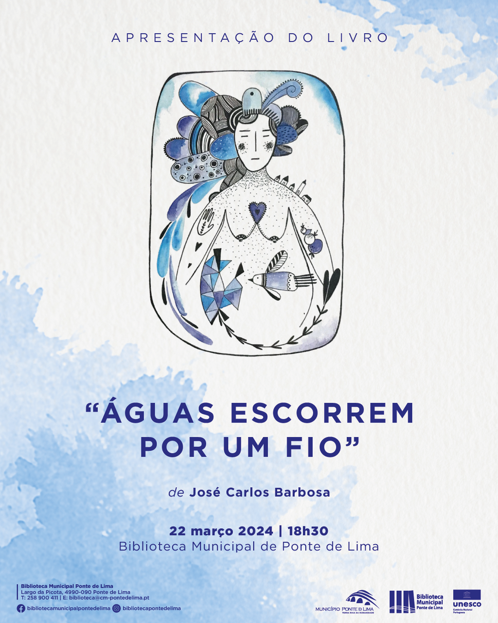 O Município de Ponte de Lima vai acolher a apresentação do livro "Águas Escorrem Por Um Fio", de José Carlos Barbosa, no dia 22 de março de 2024, às 18h30, no auditório da Biblioteca Municipal de Ponte de Lima.