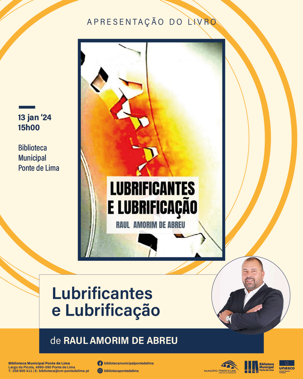 O Município de Ponte de Lima vai acolher a apresentação do livro "Lubrificantes e Lubrificação", de Raul Amorim de Abreu, no dia 13 de janeiro de 2024, às 15h00, no auditório da Biblioteca Municipal de Ponte de Lima.