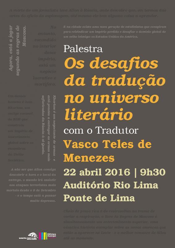 Vasco Teles de Menezes, tradutor responsável pela versão portuguesa de vários títulos de um dos mais conhecidos autores de literatura de espionagem da atualidade - Daniel Silva - estará na próxima sexta-feira, 22 de abril, pelas 09h30, no Auditório Rio Lima, para uma sessão informativa inserida nas comemorações do Dia Mundial do Livro e do Direito de Autor, dinamizada pelo Município de Ponte de Lima, através da Biblioteca Municipal.