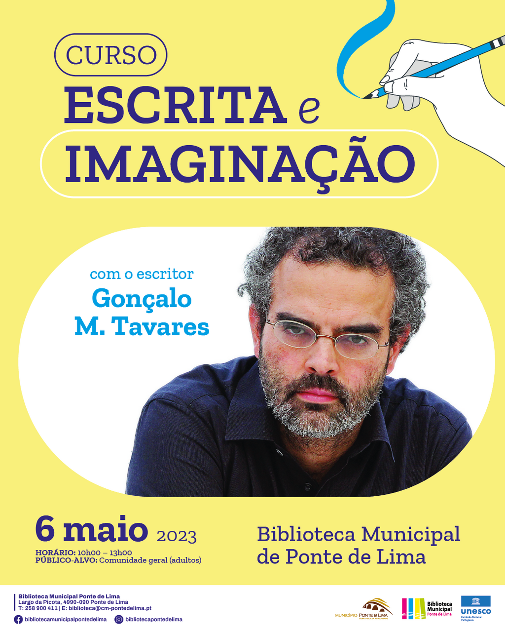 O Município de Ponte de Lima vai dinamizar um curso de "Escrita e Imaginação" com Gonçalo M. Tavares, conhecido poeta e romancista português, na Biblioteca Municipal, no dia 6 de maio, das 10h00 às 13h00.