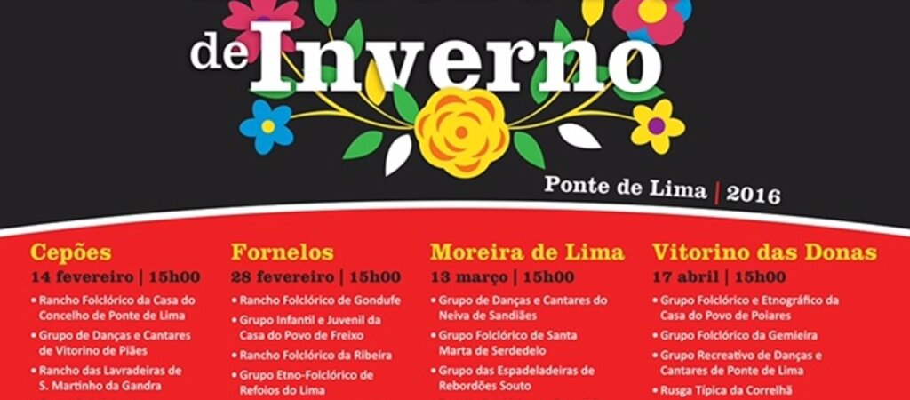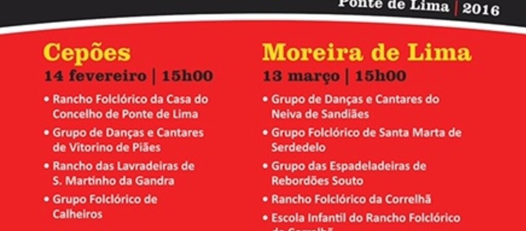 No próximo Domingo, 14 de Fevereiro, às 15h00, em Cepões - Ponte de Lima, será realizado o primeiro de quatro festivais de folclore em freguesias do concelho limiano, com entradas gratuitas, sob a designação genérica de Folclore de Inverno, dando continuidade à política de descentralização cultural que o Município de Ponte de Lima tem desenvolvido, adicionando o folclore às bandas filarmónicas, ao teatro e a outras áreas artísticas que serão divulgadas oportunamente.