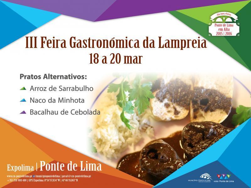 Este evento gastronómico, que vai decorrer na Expolima e nos restaurantes aderentes, encerra o projeto Em Época Baixa, Ponte de Lima em Alta, que desde novembro dinamizou onze eventos, sendo quatro feiras gastronómicas, nomeadamente o I Festival da Carne Minhota; o V Festival do Bacalhau e da Doçaria; a VIII Feira do Porco e as Delícias do Sarrabulho e, este fim-de-semana, a III Feira Gastronómica da Lampreia.