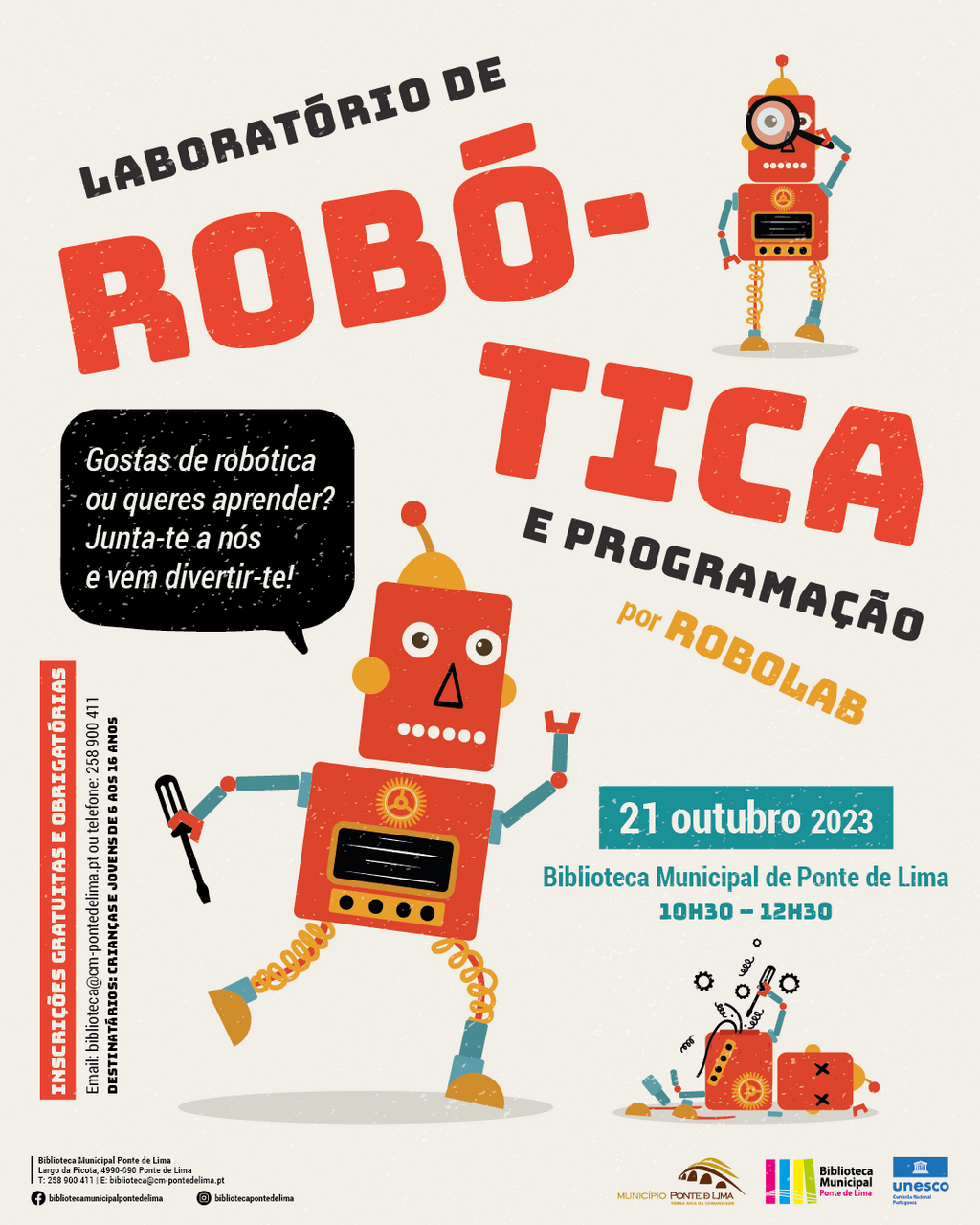 Sob a orientação dos especialistas da RoboLab, o “Laboratório de Programação e Robótica” vai ser desenvolvido uma vez por mês, aos sábados de manhã, das 10h30 às 12h30, direcionado para crianças e jovens com idades compreendidas entre os 6 e os 16 anos.
