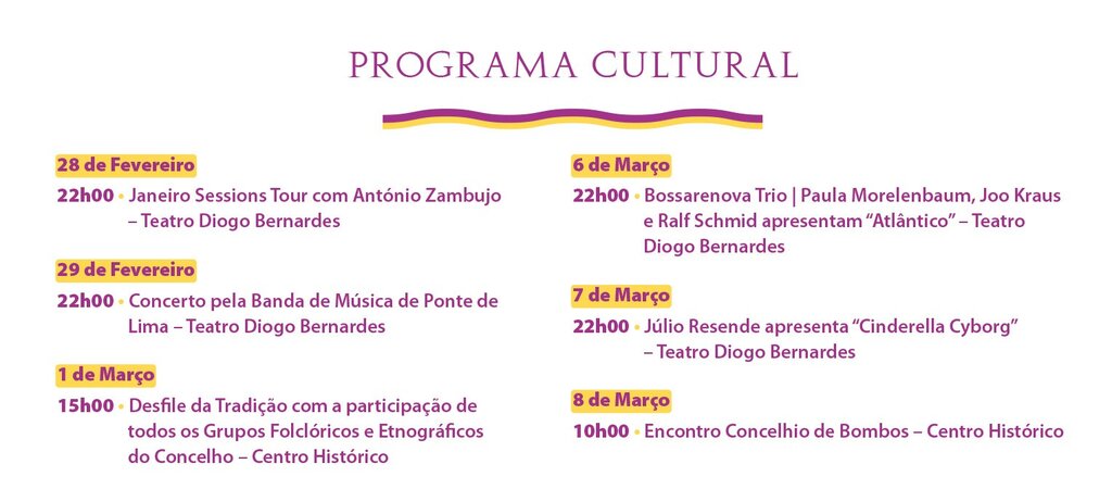 No dia 08 de março, e a fechar este programa cultural, realiza-se o encontro Concelhio de Bombos, no Centro Histórico da Vila mais antiga de Portugal, afirmando, que há quase nove séculos, mais do que destino, Ponte de Lima é Terra Rica da Humanidade detentora de uma herança cultural inimitável.