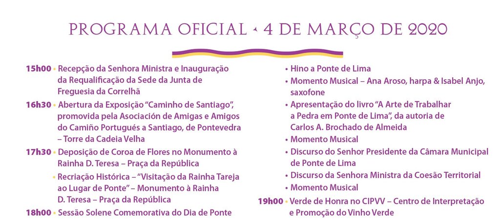 As comemorações terão como convidada de honra a Ministra da Coesão Territorial, Ana Maria Pereira Abrunhosa. Do programa consta ainda a abertura da Exposição “Caminho de Santiago”, que se irá realizar na Torre da Cadeia Velha, promovida pela Associación de Amigas e Amigos do Caminho Português a Santiago, de Pontevedra, às 16h30, à qual se segue a recriação histórica “A Visitação da Rainha Tareja ao Lugar de Ponte”, terminando este momento com a deposição de uma Coroa de Flores no Monumento à Rainha D. Teresa, na Praça da República.