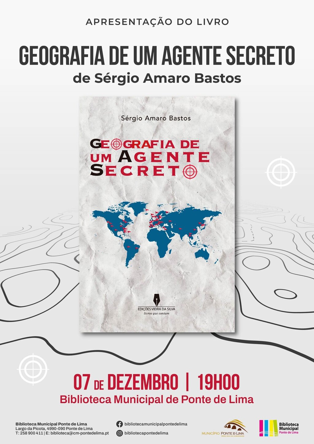 O Município de Ponte de Lima promove o lançamento do livro do autor Sérgio Amaro Bastos, intitulado "Geografia de um agente secreto", no próximo dia 07 de dezembro, pelas 19h00, na Biblioteca Municipal de Ponte de Lima.