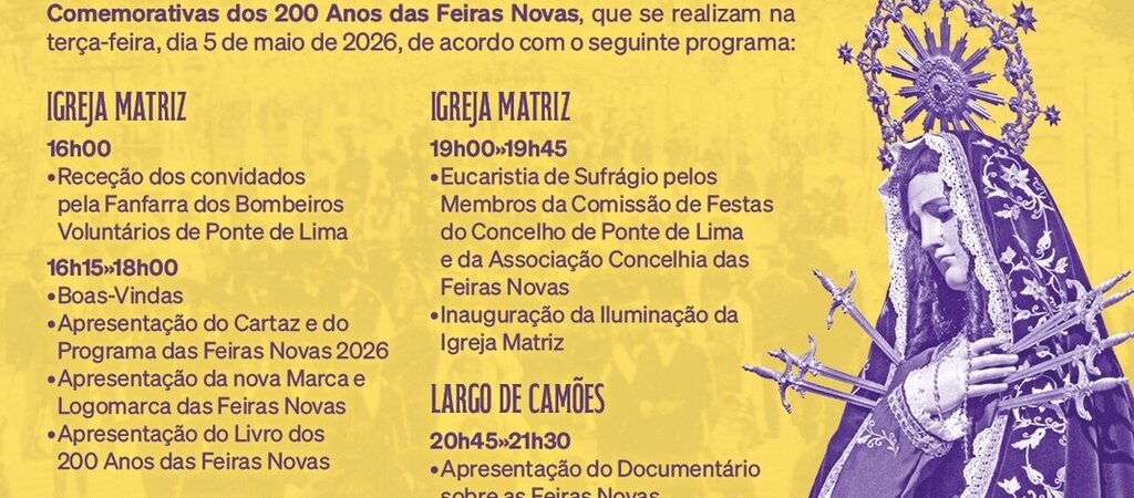 As atividades comemorativas iniciam-se às 16h00, na Igreja Matriz, com a receção dos convidados pela Fanfarra dos Bombeiros Voluntários de Ponte de Lima. Seguir-se-á a sessão oficial de boas-vindas e a revelação do cartaz e programa das Feiras Novas 2026, bem como da nova marca e logomarca do evento. Segue-se a apresentação do Livro dos 200 Anos das Feiras Novas, uma edição especial que regista a memória e a evolução desta tradição secular.