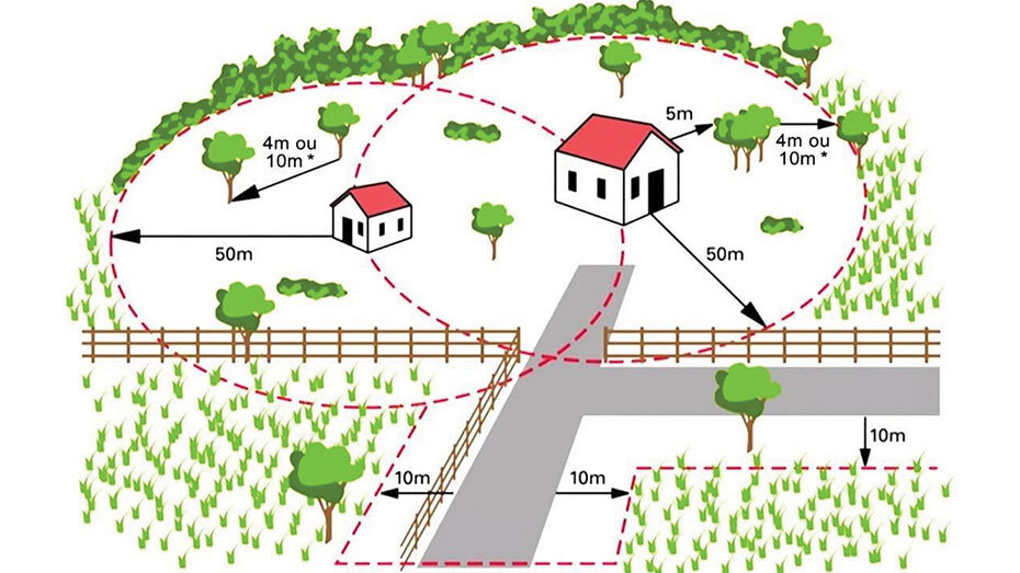 Neste contexto, segundo a lei, nesta faixa de 50 metros o chão deve estar limpo de vegetação; as árvores e os arbustos devem estar a mais de 5 metros dos edifícios; as copas das árvores têm de ter uma distância entre elas de 4 metros; as árvores têm ser desramadas até 4 metros acimo do solo e não se pode acumular lenhas ou outros produtos inflamáveis.