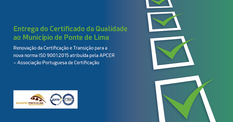 - Município de Ponte de Lima obtém Certificado da Qualidade pela norma ISO 9001:2015 | Entrega do Certificado – 30 de agosto – 15h00