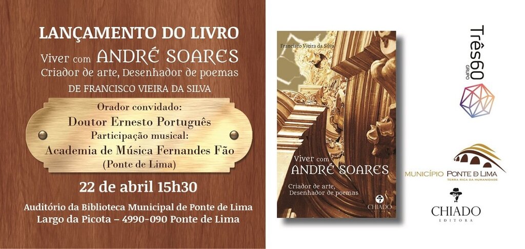 O Município de Ponte de Lima promove a apresentação do livro "Viver com André Soares", da autoria de Francisco Vieira da Silva, no próximo dia 22 de abril, pelas 15h30, no Auditório da Biblioteca Municipal de Ponte de Lima. Trata-se de uma biografia romanceada acerca de um dos maiores vultos do rococó português que se distinguiu sobretudo nos domínios da arquitetura e da talha setecentistas. Uma oportunidade para conhecer o percurso de um eminente artista bracarense, cuja importante obra se encontra espalhada pelo Norte de Portugal, designadamente por Ponte de Lima.