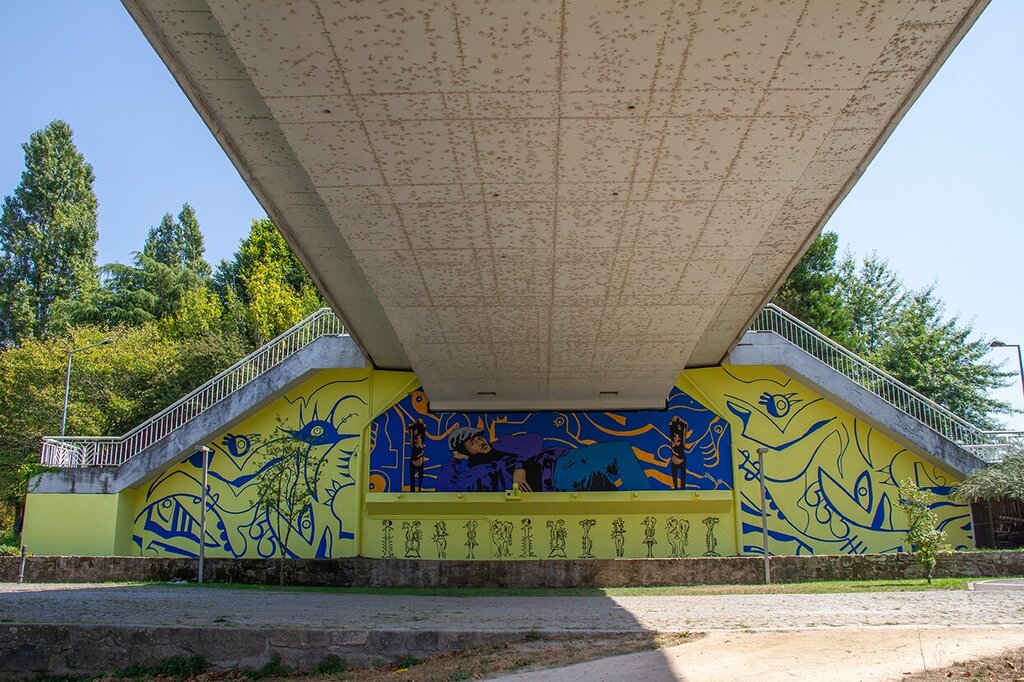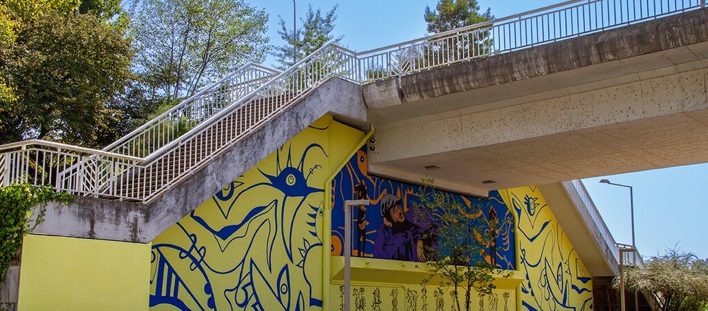 O mural com cerca de 123m², foi pintado pelas mãos de Mutes (César Amorim) e Luiz Morgadinho, com a colaboração de Maria Pires e MaLouCa.