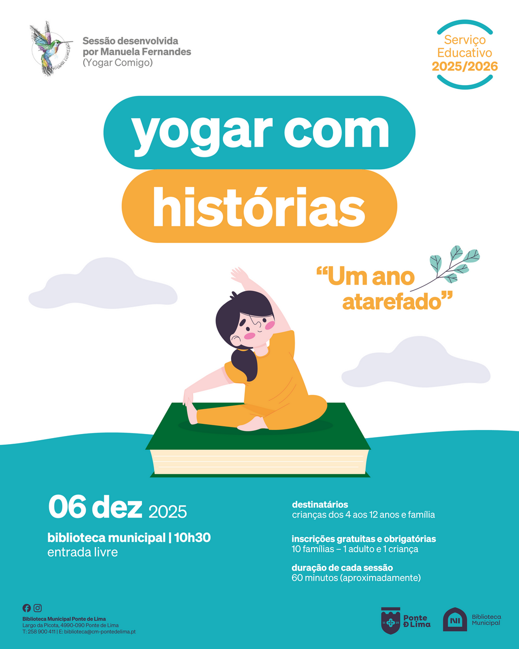 Com uma edição renovada, regressam as sessões de “Yogar com Histórias”, dinamizadas aos sábados de manhã, na Biblioteca Municipal. Estas sessões convidam crianças e jovens a embarcar numa viagem sensorial onde a literatura infantil se entrelaça com movimentos de yoga, promovendo consciência corporal, criatividade e momentos de partilha em família.