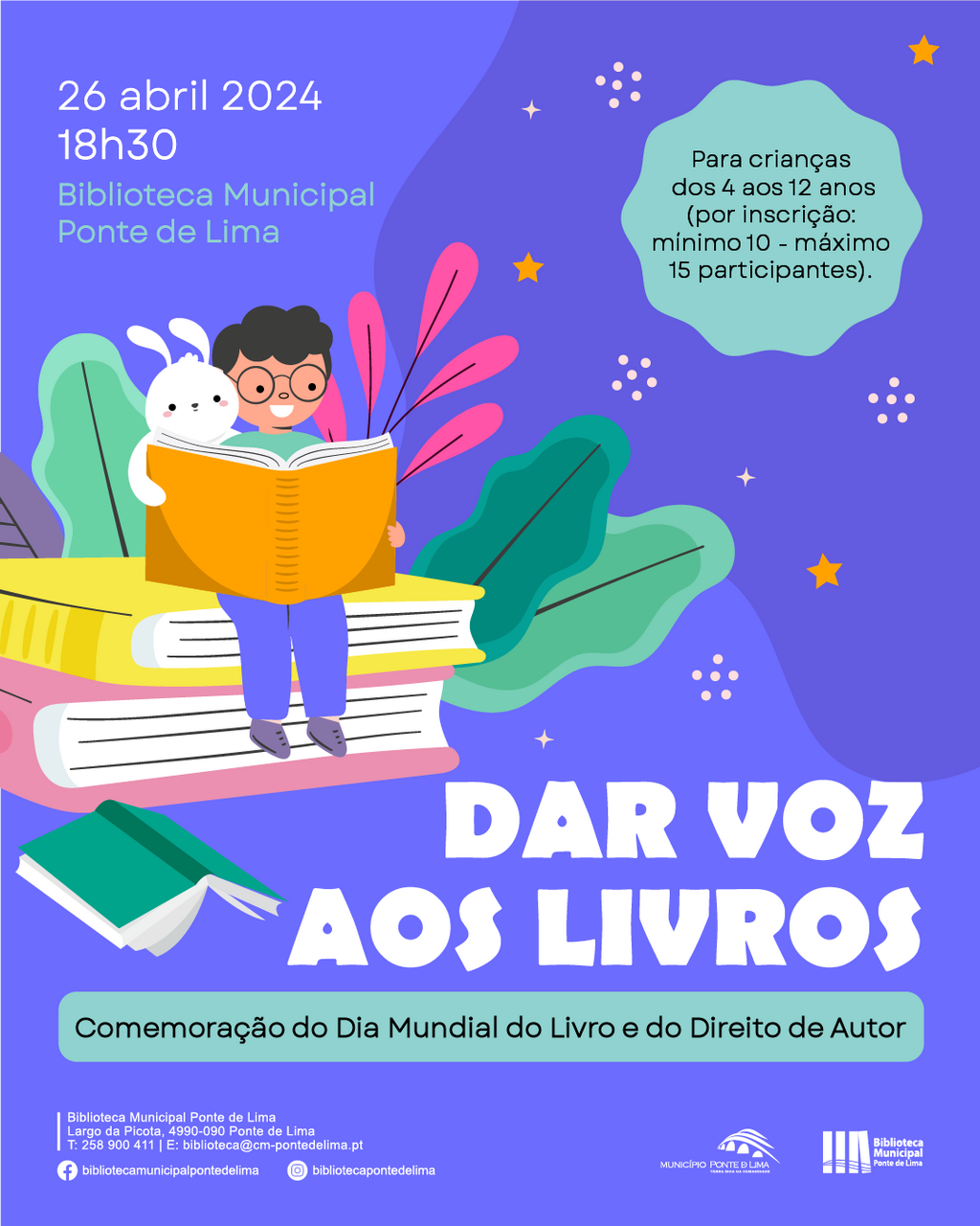 Para a celebração do Dia Mundial do Livro e dos Direitos de Autor aposta-se na promoção de atividades para o público mais novo, na Biblioteca Municipal. Assim, no dia 26 de abril a partir da ação “Dar Voz aos Livros” desenvolve-se atividades para crianças dos 4 aos 12 anos, que terão a oportunidade de desfrutar do Teatro de Fantoches “O Leão que temos cá dentro”.