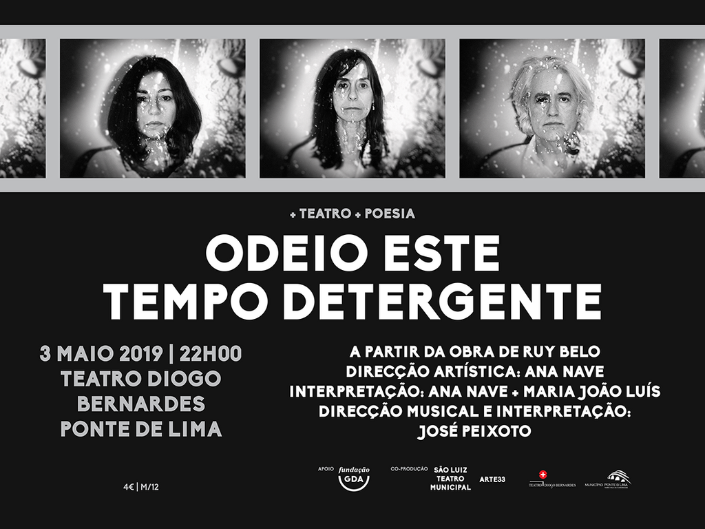 Sexta-feira à noite, dia 3 de Maio, a partir das 22h00, o Teatro Diogo Bernardes, em Ponte de Lima, apresenta o espectáculo de teatro e de poesia Odeio este tempo detergente: Uma odisseia em 17 poemas de Ruy Belo, com Direcção Artística de Ana Nave, Interpretação de Maria João Luis e de Ana Nave, Selecção de Poemas e Dramaturgia de Rui Lagartinho e Direcção Musical e Interpretação de José Peixoto..