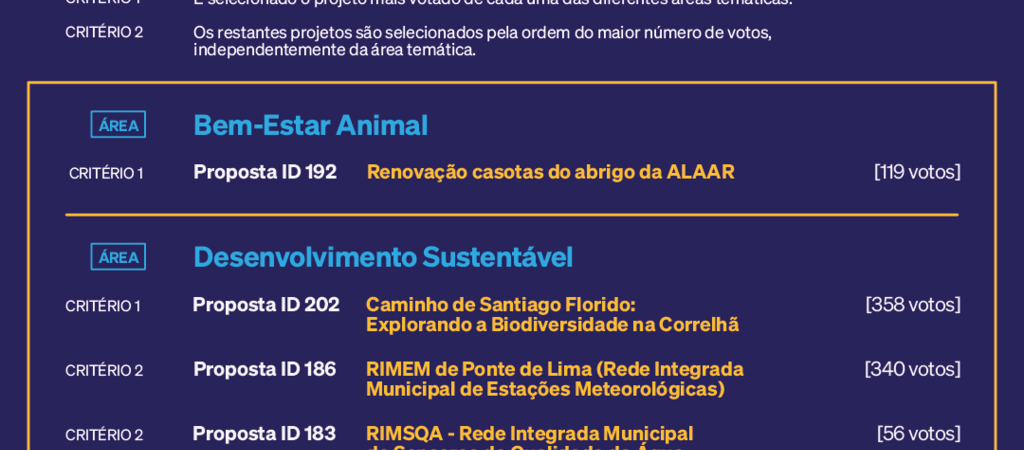 Entre 14 de novembro e 15 de dezembro, estiveram em votação 8 projetos, distribuídos por três temáticas: Bem-Estar Animal, Desenvolvimento Sustentável e Ocupação dos Tempos Livres. Dos 8 projetos a concurso, 7 propostas foram elegíveis.