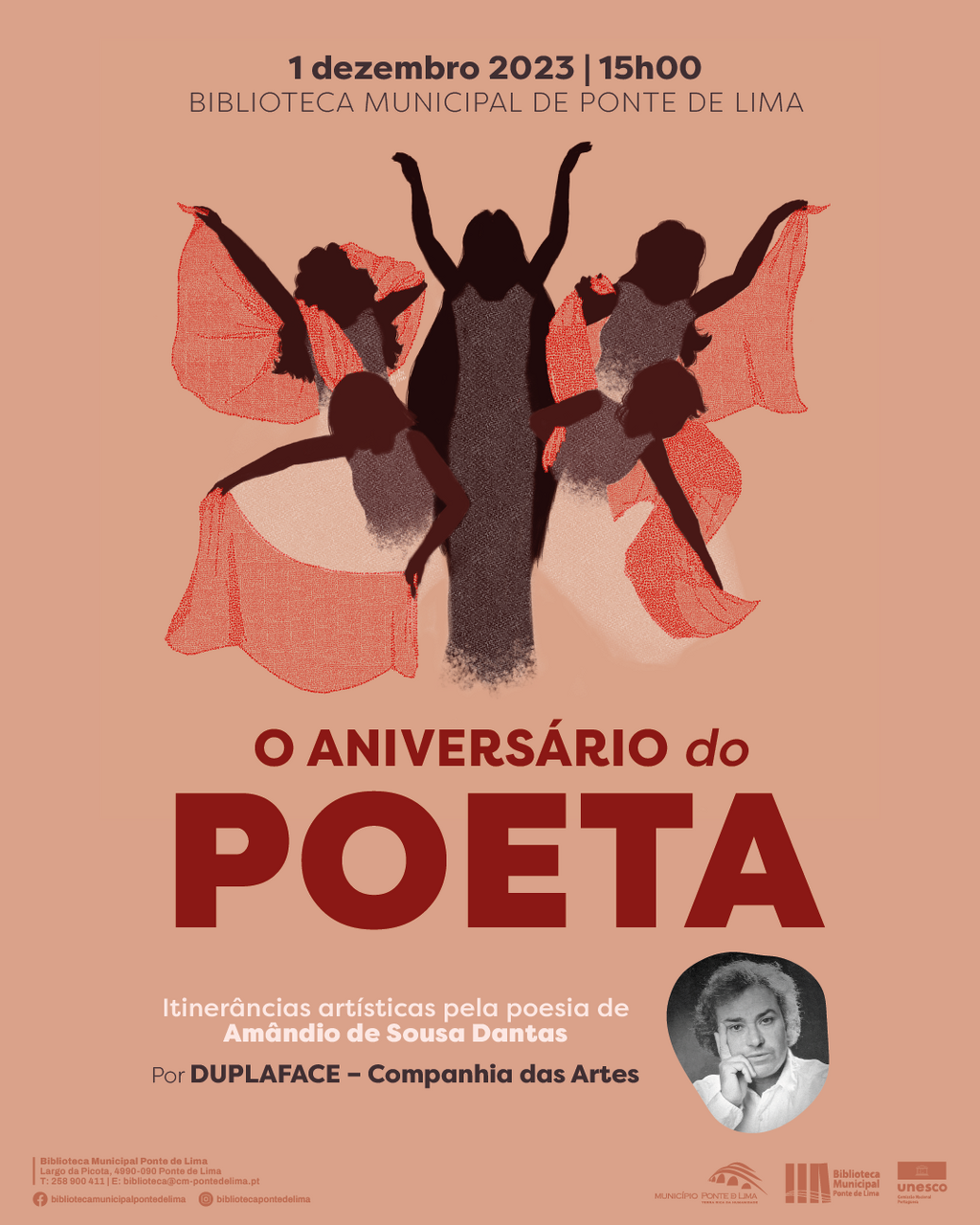Subordinada ao título "O Aniversário do Poeta: Itinerâncias artísticas pela poesia de Amândio de Sousa Dantas" esta celebração será um convite para estar presente nesta sessão, no dia 1 de dezembro de 2023, pelas 15h00, na Biblioteca Municipal, um espaço público sempre de portas abertas para a poesia que se combina livremente com música, teatro, livros e boa disposição, permitindo um próspero diálogo com intervenções, partilhas, reflexões e um salutar convívio entre todos os presentes, que recordarão este Homem das Letras.