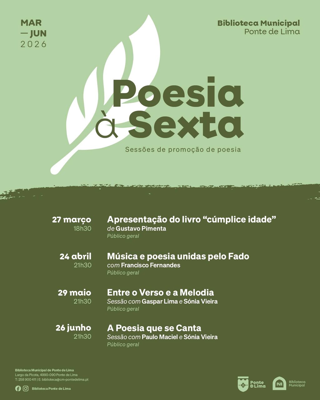 O Município de Ponte de Lima dá continuidade à sua aposta na promoção da poesia, com a realização de um novo ciclo de "Poesia à Sexta", entre março e junho de 2026, na Biblioteca Municipal. Este programa diversificado destina-se a todos os públicos e pretende celebrar a palavra poética nas suas múltiplas formas.