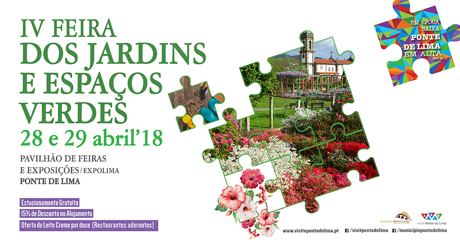 De salientar, que a IV Feira dos Jardins e Espaços Verdes faz parte do projeto “Em Época Baixa, Ponte de Lima em Alta”, com 15% de desconto no alojamento e a oferta de leite-creme por dose, nos restaurantes e alojamentos aderentes. A IV Feira dos Jardins e Espaços Verdes vai decorrer no Pavilhão de Feiras e Exposições que se situa a cerca de 5 minutos a pé do centro da vila, espaço este dotado de um grande parque de estacionamento gratuito.