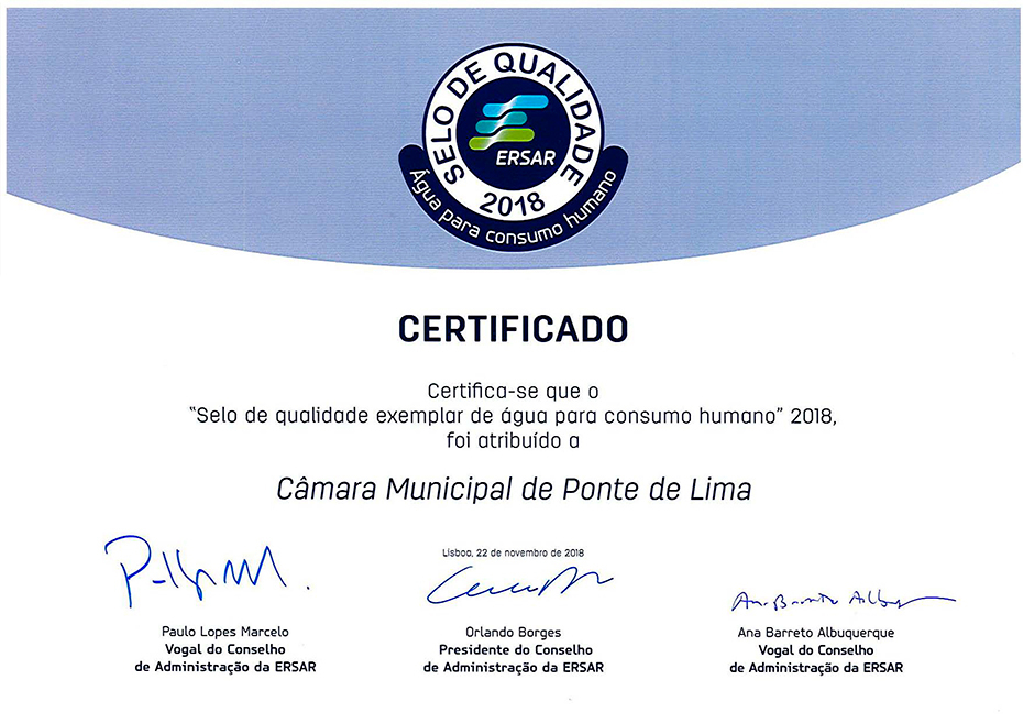 A distinção foi atribuída pela ERSAR – Entidade Reguladora dos Serviços de Águas e Resíduos, que no âmbito da iniciativa “Prémios e Selos de Qualidade dos Serviços de Águas e Resíduos” atribuiu ao Município de Ponte de Lima o Selo de Qualidade Exemplar da Água para Consumo Humano”.